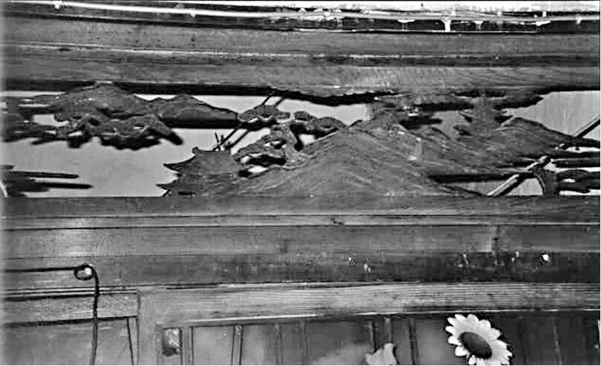 1-7 图为“大一沙龙”慰安所时代的木雕——日本滋贺县琵琶湖的风景。从艺术风格来看,这些木雕是日本人从日本国内带来的。(苏智良1995年摄)