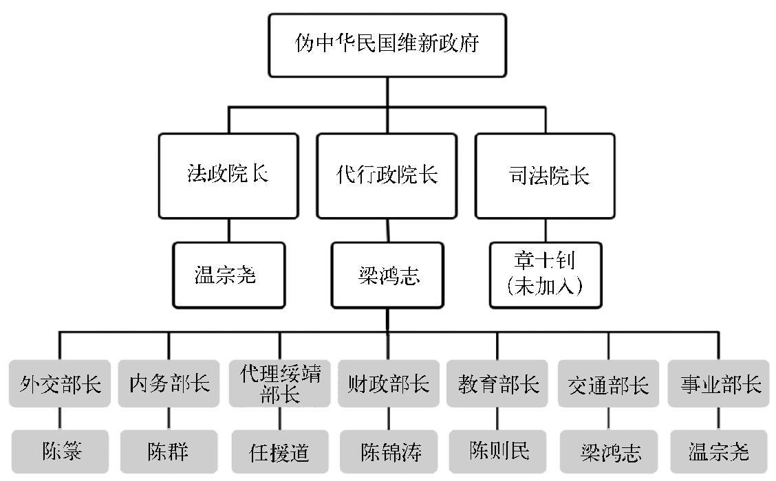 “维新政府”虽然宣告成立,但同“临时政府”一样,无从得到充分的“实力”。唐绍仪并未答应出山,“维新政府”的组成人物主要分为温宗尧、梁鸿志、陈群3派,也可以分为3类,包括北洋军阀旧人,如梁鸿志等;国民党失意政客,如温宗尧、陈群等;附敌知识分子,如陈则民等。其中安福系军阀残余如梁鸿志等人,居重要地位。