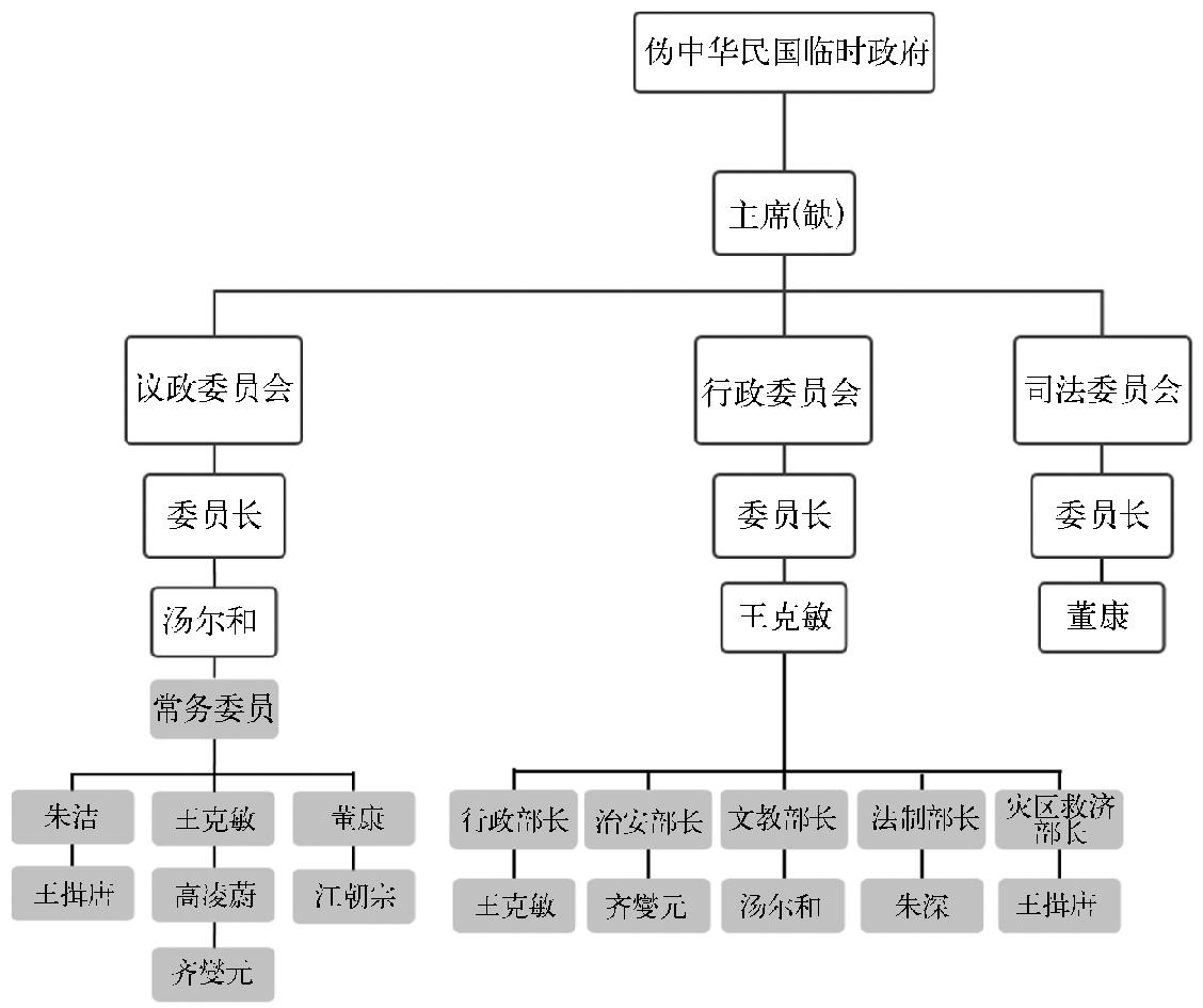 “临时政府”的政治体制放弃了国民政府的五院制,而实行所谓三权分立体制,下设行政、议政、司法3个委员会,分别负责行政、立法、司法三权(司法权具体则由法院执行),而“临时政府”的代表则为行政委员长。