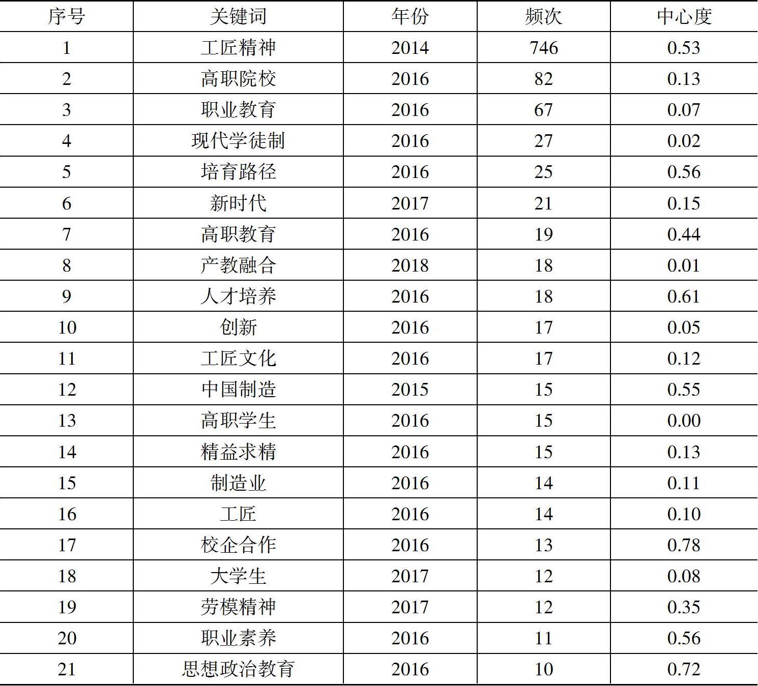 在2010—2019年工匠精神研究高中心性关键词中,“工匠精神”的词频数为746,排序第一。关键词“工匠精神”自己的共现网络中,“工匠精神”与“高职院校”“职业教育”“中国制造”“精益求精”“传承”等相关关键词共现,从中可以看出,工匠精神与产品的精益求精、技术的传承发展、制造业的创新升级紧密相连;而“职业教育”“高职院校”相对于其他关键词,更加频繁地被提及,说明工匠精神的重要意义已形成共识,而培育和弘扬工匠精神已成为实施中国制造2025的重要议题。