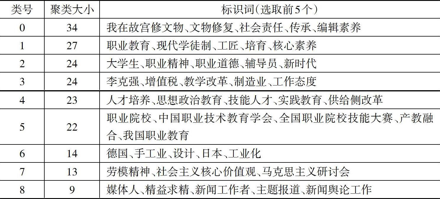 设定时间跨度为2010—2019,时间切片为“1年”,节点类型为“关键词”,运行“城市空间”,得出节点数为211、连线数为223、密度为0.01、Q值为0.85、S值为0.59的关键词共现图与节点数为211、连线数为317、密度为0.014、Q值为0.66、S值为0.49的关键词聚类共现图;为更清晰呈现,将频次高于10的关键词整理成工匠精神研究高中心性关键词表(表2-1),并在关键词聚类共现图谱基础上,在“聚类”菜单栏目中选择“聚类汇总”,得到关键词共现网络聚类表(表2-2)。关键词的中心性越强则说明该节点在网络中的位置越重要,具有转折或者促进学科突破发展的桥梁作用(李群等,2019)。Q值(Modularity),是指聚类模块值,模块值大于0.3意味着聚类结构显著;S值(Silhouette),是指聚类平均轮廓,平均轮廓值大于0.5,表示聚类比较合理。