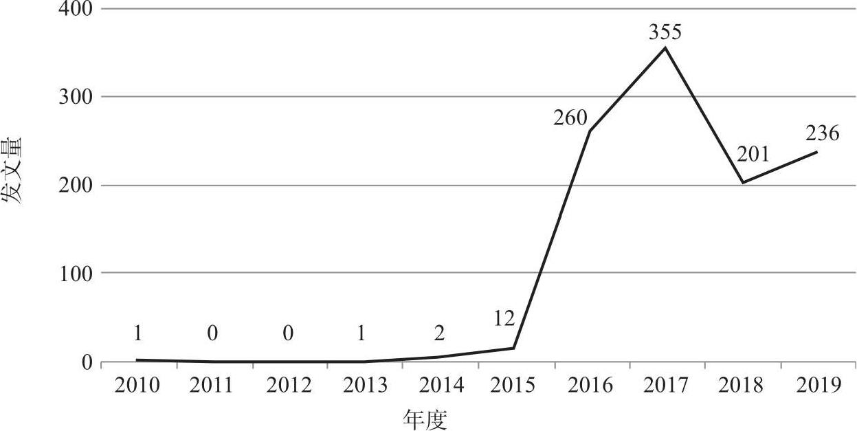 从文献发表年份来看,2010—2019年期间,2015年之前工匠精神相关的研究文献数量很少,基本每年只有1篇,从2015年特别是2016年以后,学界对工匠精神的研究逐渐活跃,关于工匠精神的论文数量开始快速增长(图2-1),2017年文献量达到峰值355篇,此后一直保持在每年200篇以上。2016年是“工匠精神”首次出现在《政府工作报告》中的年度,并在此后多次被国家领导人提及,工匠精神研究的活跃变化从侧面说明,国家战略需求、社会实践始终是研究工作发展的动力源泉。