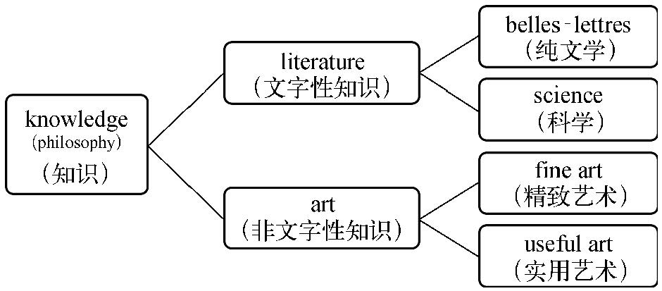 人类的知识(knowledge;philosophy)可以分为文字性和非文字性两大类,literature是存在于文字中的知识和想象力的全部成果,在相当长的历史时期,这是一个无所不包的概念。但是19世纪中叶,在日常的狭义用法上,将literature分为:纯文学(polite literature;belles-lettres)和实证科学(positive science),也就是说将science从literature中分离出来了。这样做是为了避免研究领域过于广泛。另一方面,非文字的art是运用知识或力量达到预期目的的知识领域。古希腊将art分为自由人的art和奴隶的art,现在则分为精致(fine art)和实用(useful art)两类。前者包括音乐、诗歌、雕塑等,并无直接的世俗性目的,后者则与人类的日常生活密切相关。
