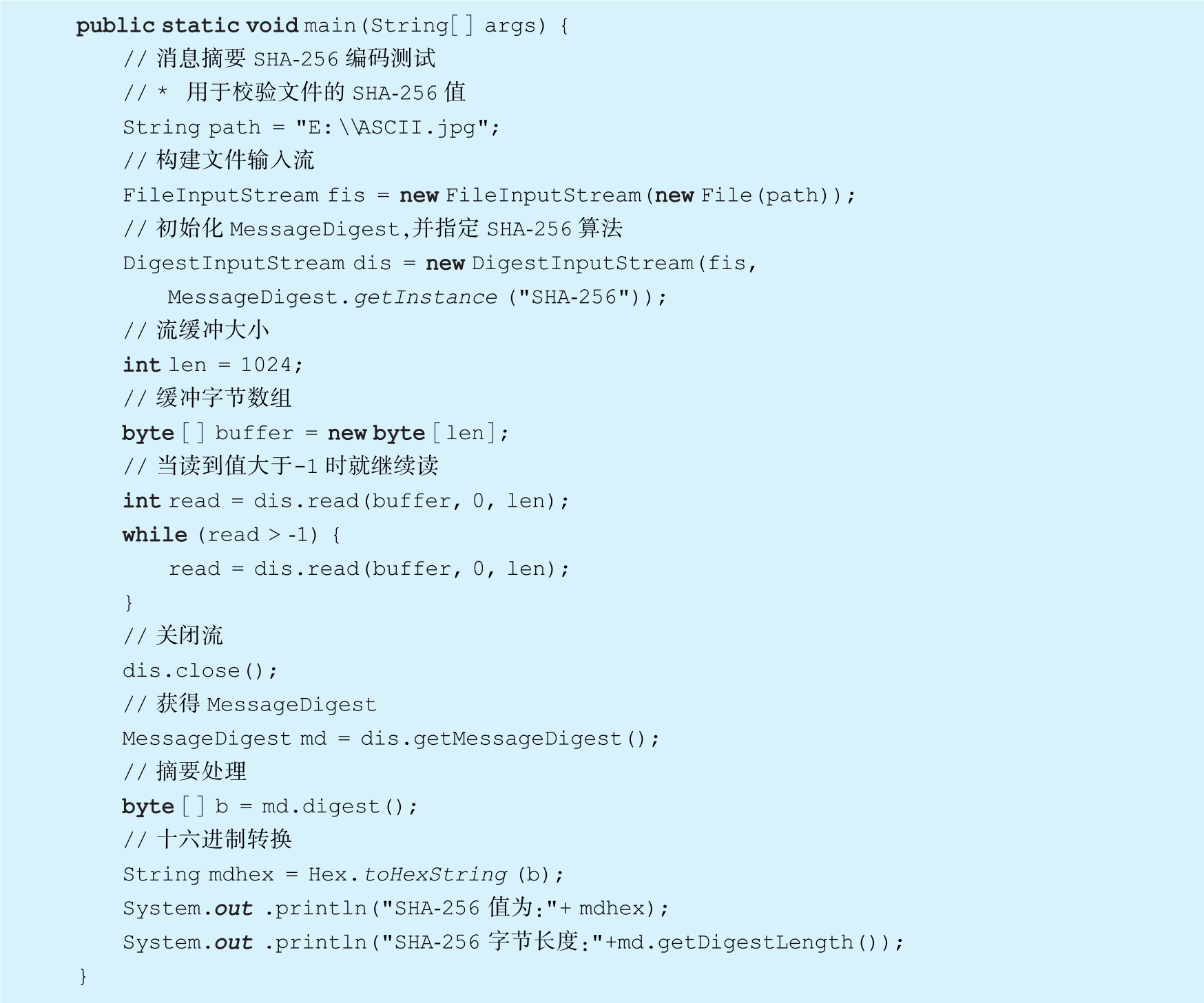 1)准备原始信息。先定义path字符串,选择一个文件路径;然后实例化一个FileInputStream对象,实例化对象后相当于打开了这个文件,进行读取准备;接下来构建DigestInputStream对象,包含两个参数,一个是前面的输入流对象,另一个是SHA-256的摘要对象。