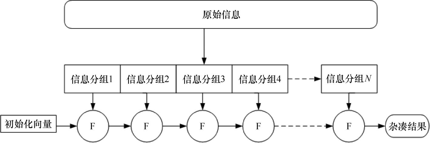M-D架构是Merkle-Damgard结构的简称,它是非常常用的杂凑算法的构造方式。M-D架构首先对经过填充的信息进行均匀分组,然后把分组后的信息按照顺序进入压缩函数F。而压缩函数F先使用初始化向量进行初始化,结合第一个信息分组完成压缩,F的输出信息块和第二个信息块进行结合再输入F进行压缩,然后传递到下一次的分组信息,如此循环操作,最后一个压缩函数的结果将作为最终的杂凑值返回。杂凑原理示意如图3-1所示。