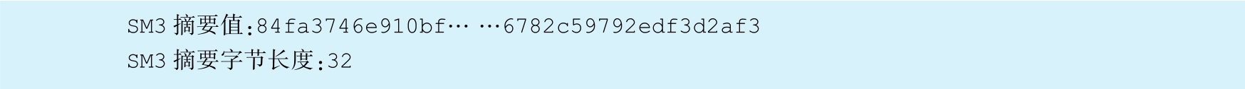 从前面的运行结果输出可以看出,摘要的长度是32字节,即256位。由于SM3是我国推荐使用的算法之一,也是合规要求的标准算法。
