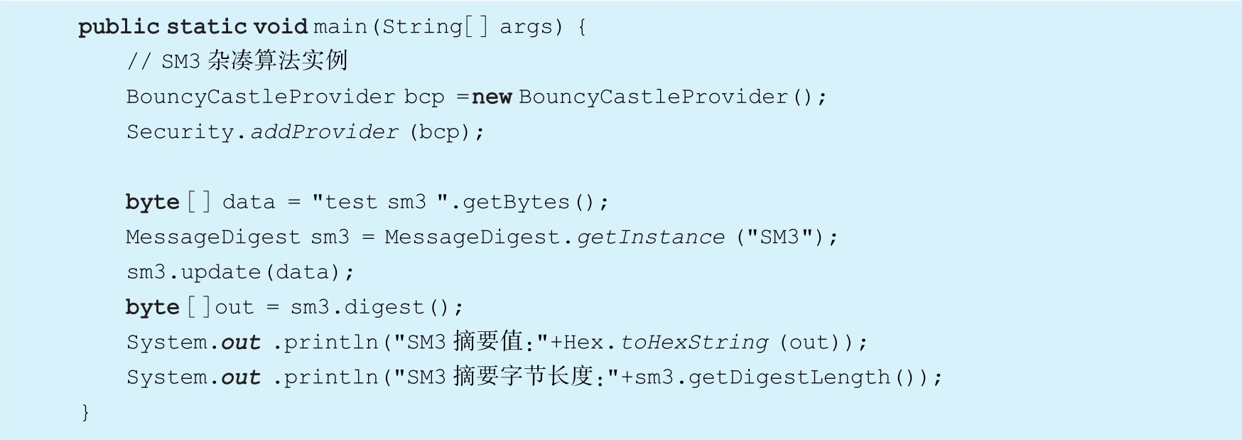 有关信息填充方法、初始化向量选择方法等SM3算法的原理细节,请参考GM/T 0004—2012《SM3密码杂凑算法》,本书不再展开。下面介绍杂凑算法实践。