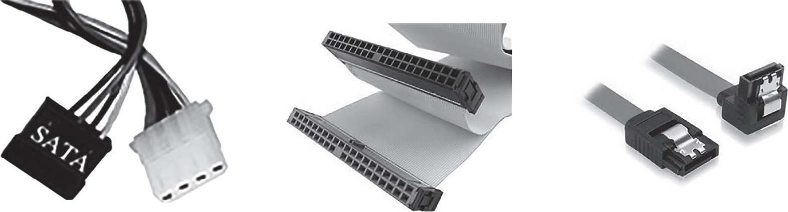 图1-23展示了硬盘的电源线、并口数据线和串口数据线。硬盘常以GB为单位。目前常见的硬盘容量一般为500GB~3TB。