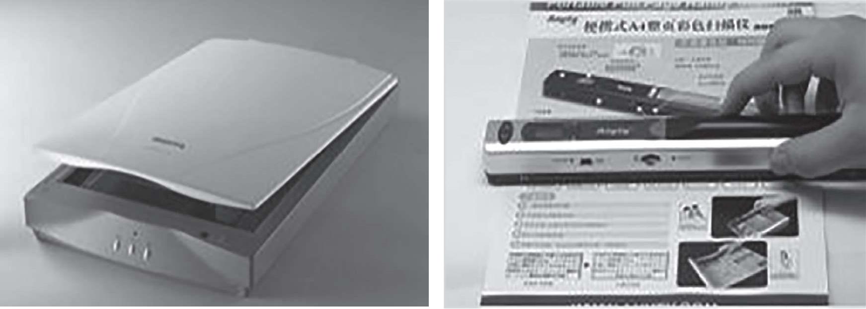 据工作原理的不同,扫描仪分为平板扫描仪、底片扫描仪、滚筒扫描仪、手持式扫描仪4种(见图1-25)。扫描仪的接口是指与计算机主机的连接方式,常用的有USB接口、SCSI接口和并行打印机接口。