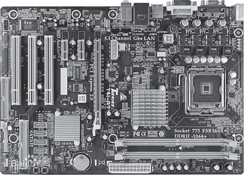 主板安装、固定在机箱内,是微机最基本的也是最重要的部件之一。它是计算机中最大的一块电路板,上面布满了用于连接声卡、显卡、调制解调器、内部存储器等其他设备的各种插槽、接口(可连接鼠标、键盘等)、插座等(见图1-20)。其核心控制部件是芯片组,具有支持CPU、管理内部存储器的作用。主板的类型和档次决定着整个微机系统的类型和档次,主板的性能影响着整个微机系统的性能。现在很多主板还集成了显示卡、声卡和网卡的功能。