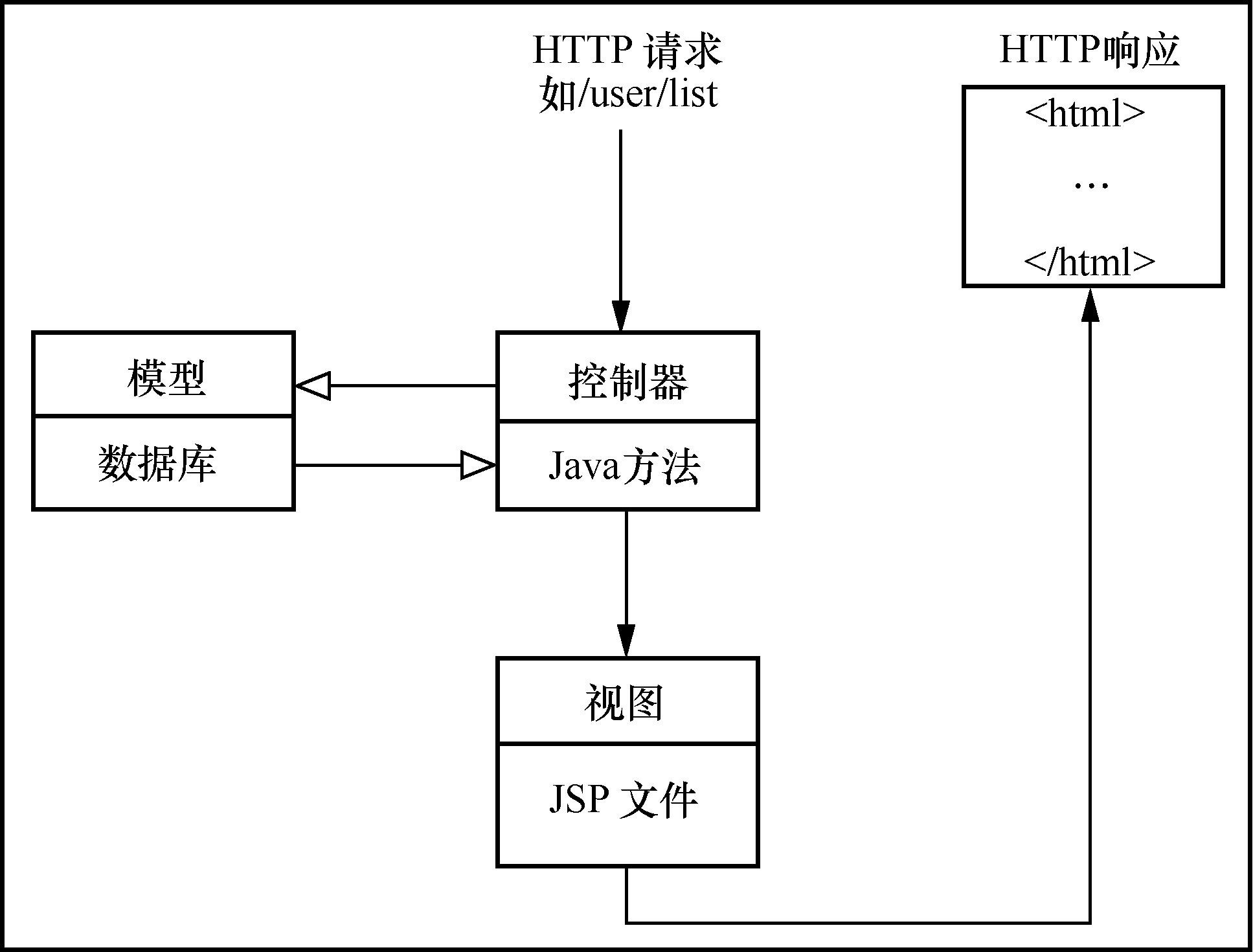 Spring Web应用程序使用模型-视图-控制器(Model-View-Controller,MVC)设计模式来处理HTTP请求。如图2-3所示,用户发起HTTP请求(如路由到/user/list),然后执行控制器方法。控制器(Controller)是POJO用@Controller注解的简单Bean,每个控制器类都包含通过@RequestMapping映射到请求URL的方法注解,用于处理不同的HTTP请求。最后,呈现视图(如JSP文件),并返回生成的HTML页面作为响应。