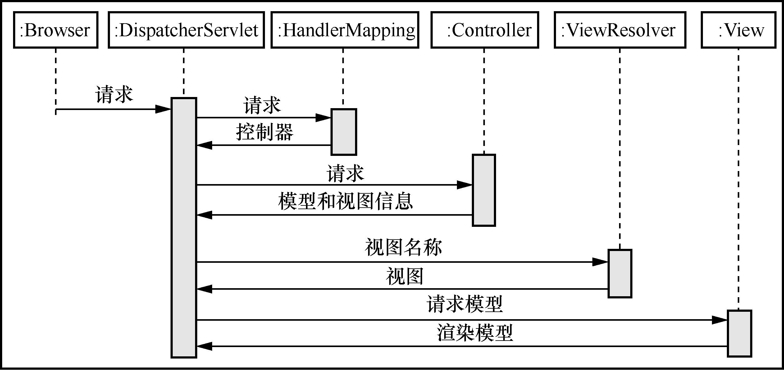 DispatcherServlet通常在web.xml中进行定义,默认使用WebApplicationContext作为上下文,Spring默认配置文件为/WEB-INF/servlet.xml。Spring MVC请求的处理机制如图2-4所示。