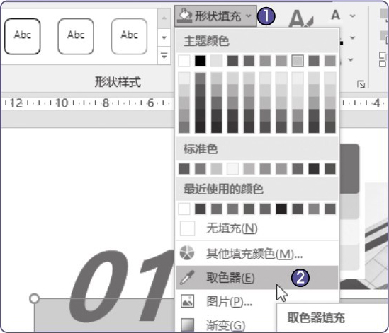 STEP 2 选中大矩形,在“绘图工具-格式”选项卡中单击“形状填充”下拉按钮 1 ,在其列表中选择“取色器”选项 2 ,如图1-21所示。
