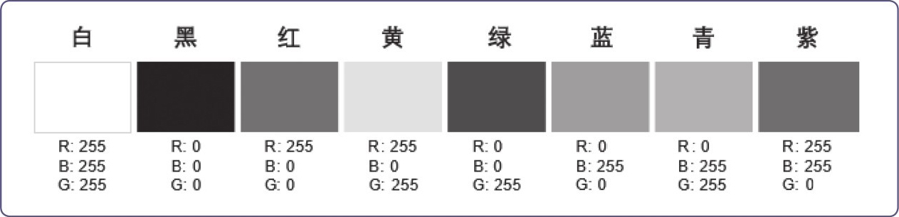 每种颜色都有它独有的色值,为了能够准确地区分各种颜色,系统使用R、G、B 3种颜色的数值(0~255)来表示某个具体的颜色。R代表红色,G代表绿色,B代表蓝色。将这3种颜色按不同的比例混合在一起,可产生各种不同的颜色。