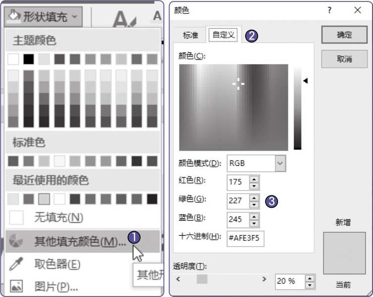 当用户获取到所需的RGB值后,只需在设置填充色时,选择“其他填充颜色”选项 1 ,在弹出的“颜色”对话框中选择“自定义”选项卡 2 ,再输入“红色(R)”“绿色(G)”“蓝色(B)”参数的值 3 即可,如图1-28所示。