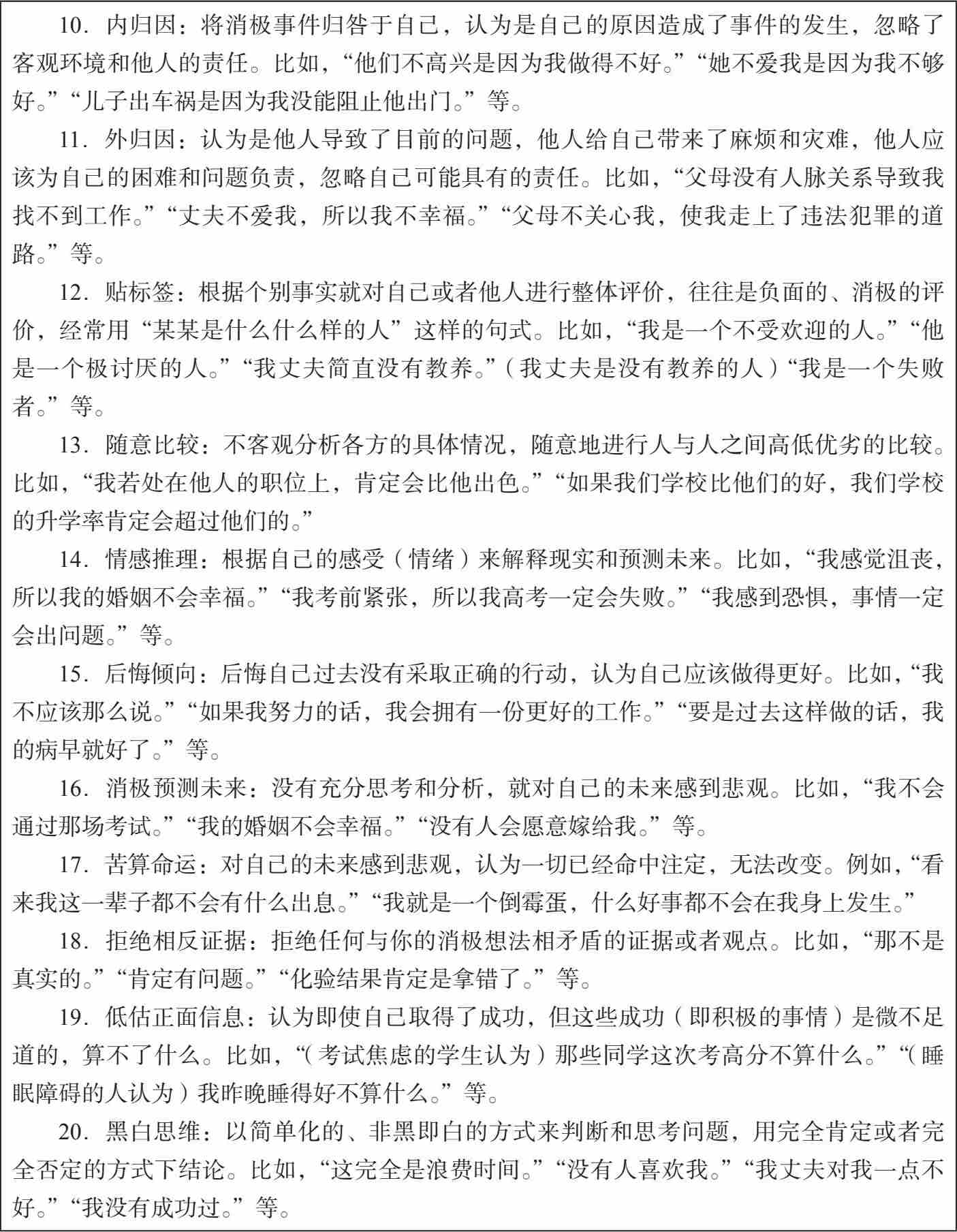 以此为基础,求助者完成监控自动思维的家庭作业的时候,不仅要自己识别出自动思维,还要对自动思维进行归类,把它归到某个认知歪曲的类型中。另外,咨询会谈中咨询师与求助者完成横向概念化(确定情境、自动思维、情绪和行为内容)后,可以把自动思维归类到某个认知歪曲类型中。