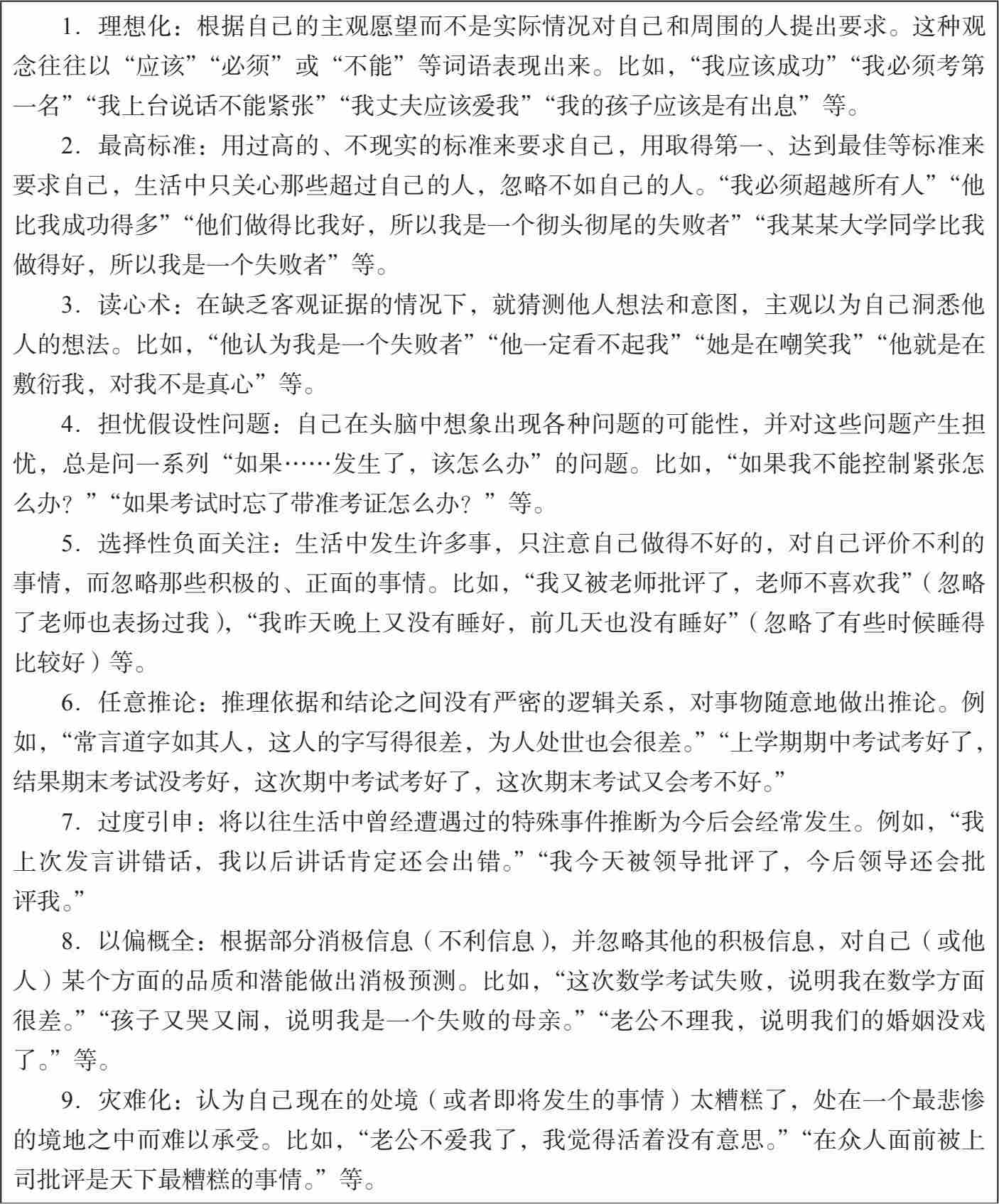 我们以前面这位恐惧黑夜的个案为例说明认知歪曲归类技术的应用。从前面的对话我们已经知道求助者恐惧情绪体验引发了“晚上可能会发生不好的事情”的自动思维。应用认知歪曲归类技术,咨询师就需要把她的自动思维归到一种或多种认知歪曲类型中。要做到这一点,咨询师就需要对她解释认知歪曲概念,并说明每个认知歪曲内容的含义,必要时举例说明。