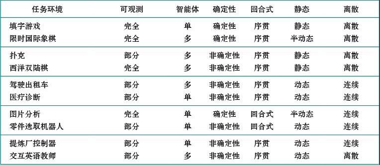人工智能中可能出现的任务环境范围显然非常广泛。然而,我们可以确定相当少的维度,并根据这些维度对任务环境进行分类。这些维度在很大程度上决定了恰当的智能体设计以及智能体实现的主要技术系列的适用性。首先我们列出维度,然后分析几个任务环境,阐明思路。这里的定义是非形式化的,后面的章节提供了每种环境的更精确的陈述和示例。