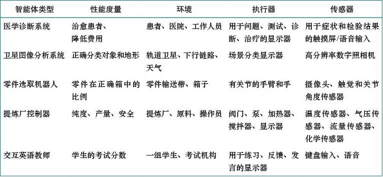 图2-5 智能体类型及其PEAS描述的示例