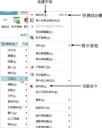 菜单包含本软件的主要功能,系统的所有命令和设置选项都能在菜单中找到,具体包括“文件”菜单、“编辑”菜单、“视图”菜单、“插入”菜单、“格式”菜单、“工具”菜单、“装配”菜单、“信息”菜单、“分析”菜单、“首选项”菜单、“应用模块”菜单、“窗口”菜单、“GC工具箱”菜单和“帮助”菜单。