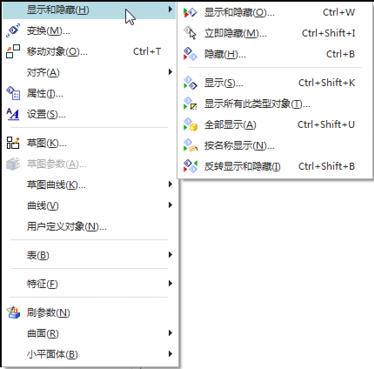 当工作区中对象太多,不便于操作时,需要暂时将不需要的对象隐藏起来,如模型中的草图、基准面、曲线、尺寸、坐标、平面等。
