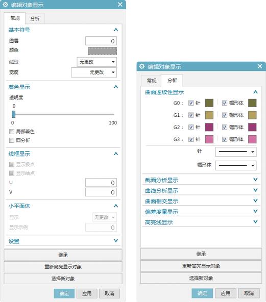 (1)曲面连续性显示:为选定的曲面连续性分析对象指定可见性、颜色和线型。