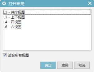 (2)打开:选择该命令后,打开图2-33所示的“打开布局”对话框,在当前文件的布局名称列表框中选择要打开的某个布局,系统会按该布局的方式来显示图形;若勾选“适合所有视图”复选框,系统会自动调整布局中的所有视图。