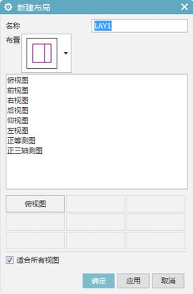 (1)新建:选择该命令后,打开图2-32所示的“新建布局”对话框,用户可以在其中设置布局的形式和各视图的视角。建议用户在自定义布局时输入自己的布局名称。默认情况下,UG会按照先后顺序将每个自定义布局命名为LA Y 1、LA Y 2等。