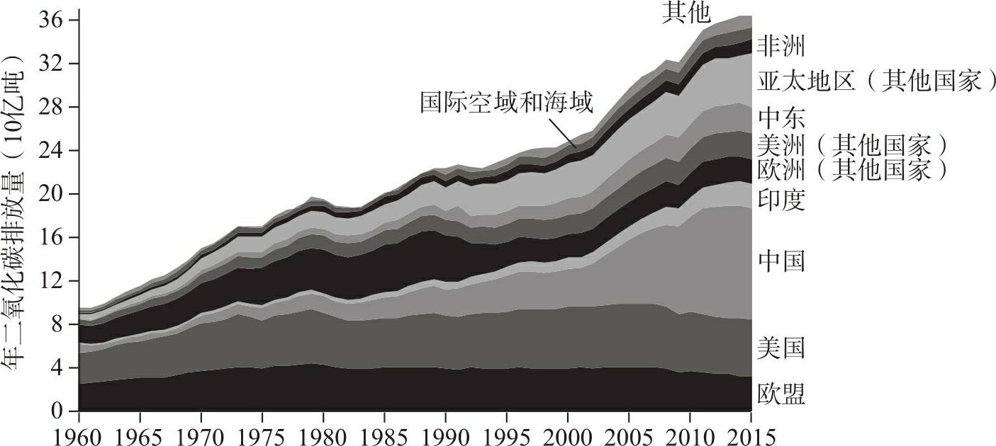资料来源: Our World in Data ,Ritchie & Roser 2017,数据基于二氧化碳信息分析中心与Le Quéré et al. 2016。“国际空域和海域”(International air & sea)是指航空和海上运输造成的排放,在原始资料中与“加注燃料”(Bunker fuels)相对应。“其他”是指全球二氧化碳排放量估计值与各区域、国家总量之和之间的差异,对应于原始资料中的“统计差异”(Statistical difference)部分。