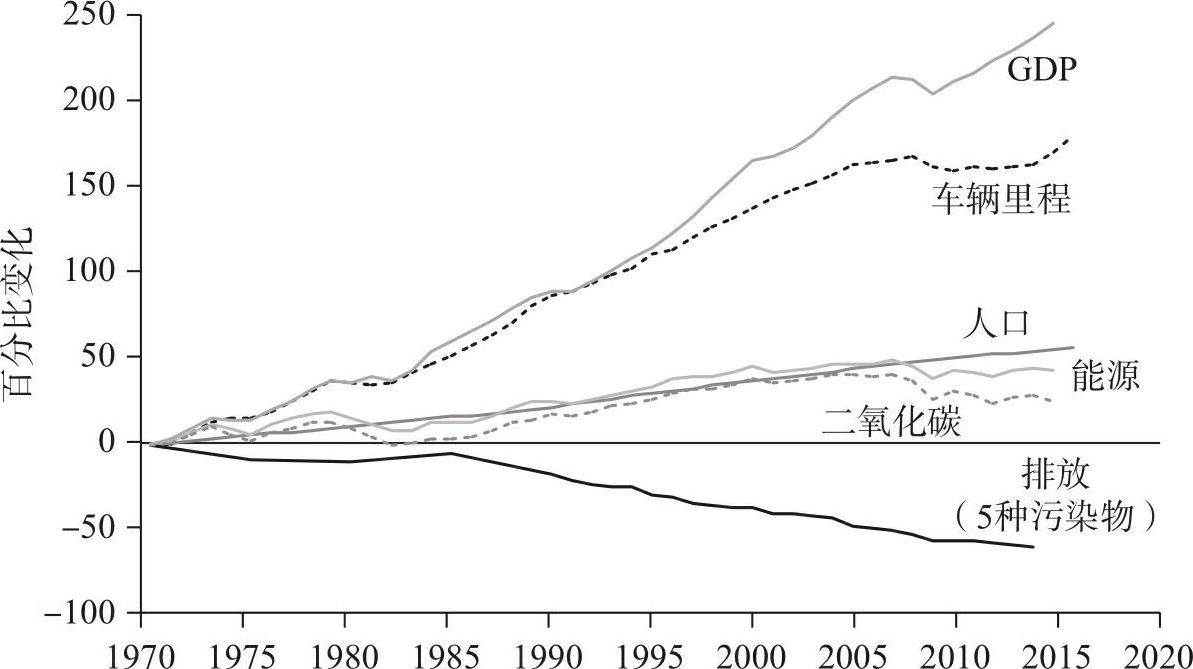 图10-3 美国污染、能源和增长(1970—2015年)