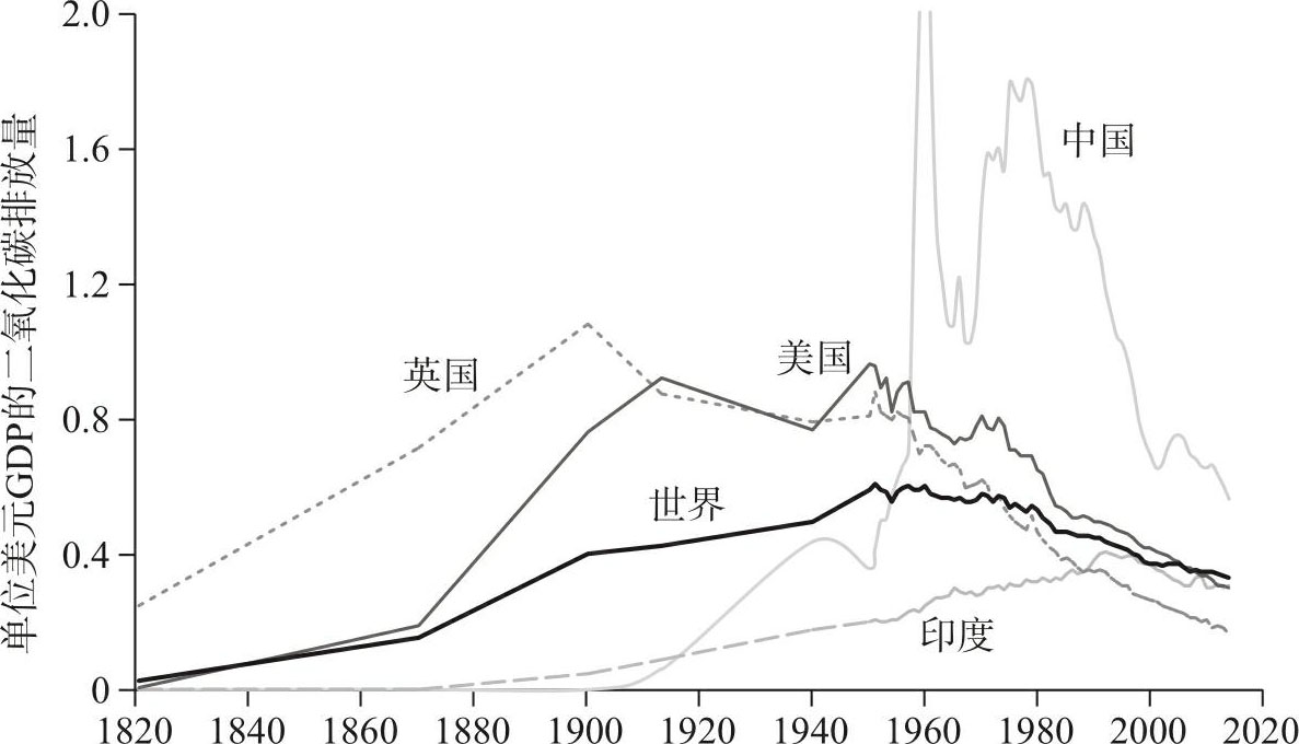 如图10-7所示,碳排放遵循库兹涅茨曲线:当美国和英国等富国实现工业化时,它们排放越来越多的二氧化碳以生产1美元的GDP,但情况在20世纪50年代出现转变,自那时以来的碳排放逐渐减少。中国和印度正在沿着相同的轨迹发展,20世纪70年代后期和90年代中期分别达到单位产值碳排放顶峰。近半个世界以来,整个世界的碳强度一直在下降。