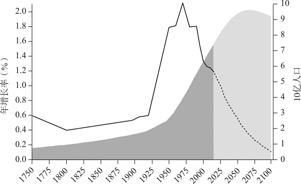 资料来源: Our World in Data ,Oritz-Ospina & Roser 2016d。1750—2015年:United Nations Population Division和History Database of the Global Environment(HYOE),PBL Netherlands Enviromental Assessment Agency(未注明日期)。2015年后:预测年增长率与1750—2015年数据来源相同。人口数量预测值见国际应用系统分析研究所,中期预测(加总各个国家预测值且考虑教育的影响),Lute,Butz & Samir 2014。