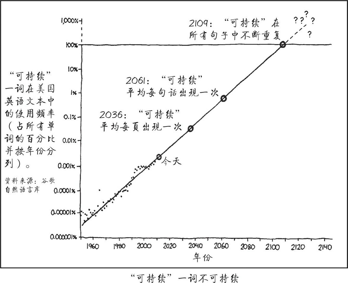 诚然,这种思维方式与“可持续性”的伦理观格格不入。在图10-2中,漫画家兰德尔·门罗(Randall Munroe)说明了这个时髦词语和神圣价值所存在的问题。可持续性理论假定某种资源现在的消耗速率会延伸到未来,直到达到上限为止。这意味着,我们必须转而使用可再生资源,因为可再生资源可以按照我们使用的速率无限地得到补充。事实上,社会总是早在旧资源耗尽之前就将之放弃转而使用更好的资源。人们常说,并不是因为世界上的石头都用完了,所以石器时代才会结束,能源也是如此。杰西·奥苏贝尔指出:“当世界转向煤炭时,大量的木材和干草仍有待开发利用。当煤炭储备依然充足时,石油已开始崛起。现在,石油资源依然丰富,而甲烷(天然气)的使用已开始增加。”