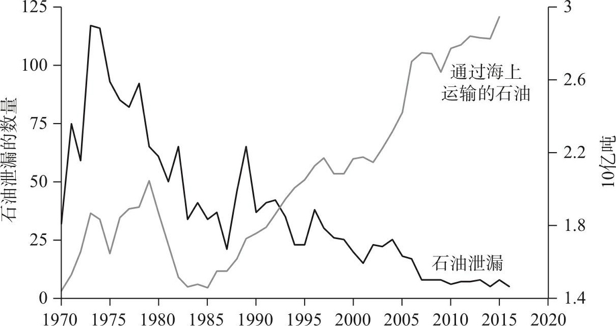 石油公司想要减少油轮泄漏事故并不是什么秘密,因为它们的利益和保护环境是一致的:石油泄漏是一场公共关系灾难(尤其是当公司的名字就印在破裂的船上时),会带来巨额罚款,当然也会浪费宝贵的石油。更有趣的是,这些公司在很大程度上取得了成功。技术遵循学习曲线,随着时间的推移变得更加安全,因为技术专家会弥补设计中最危险的漏洞(我们将在第12章中讨论这一点)。但人们在记住事故的同时,却没有意识到越来越多的技术进步。不同的技术进步按不同的时间表发生:2010年,当海运漏油事故降至历史最低水平时,固定钻井平台发生了史上第三大最严重的漏油事件,也就是墨西哥湾的“深水地平线”(Deepwater Horizon)事故。这一事故反过来推动了防井喷装置和钻井设计、监测、控制的新规定的出台。
