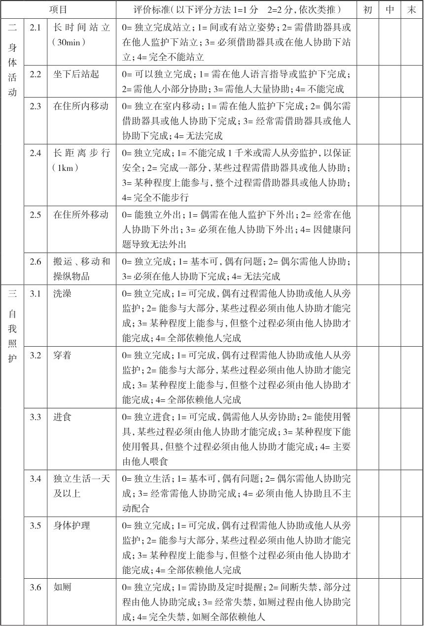 若老年人没有完全回答量表中所有的问题条目,则把未回答的问题条目视为缺失。在评定量表的各领域内所包含的多个问题条目中,如果应答者回答了至少一半的问题条目,则应计算该领域的得分。缺失条目的得分用其所属领域的平均分代替。