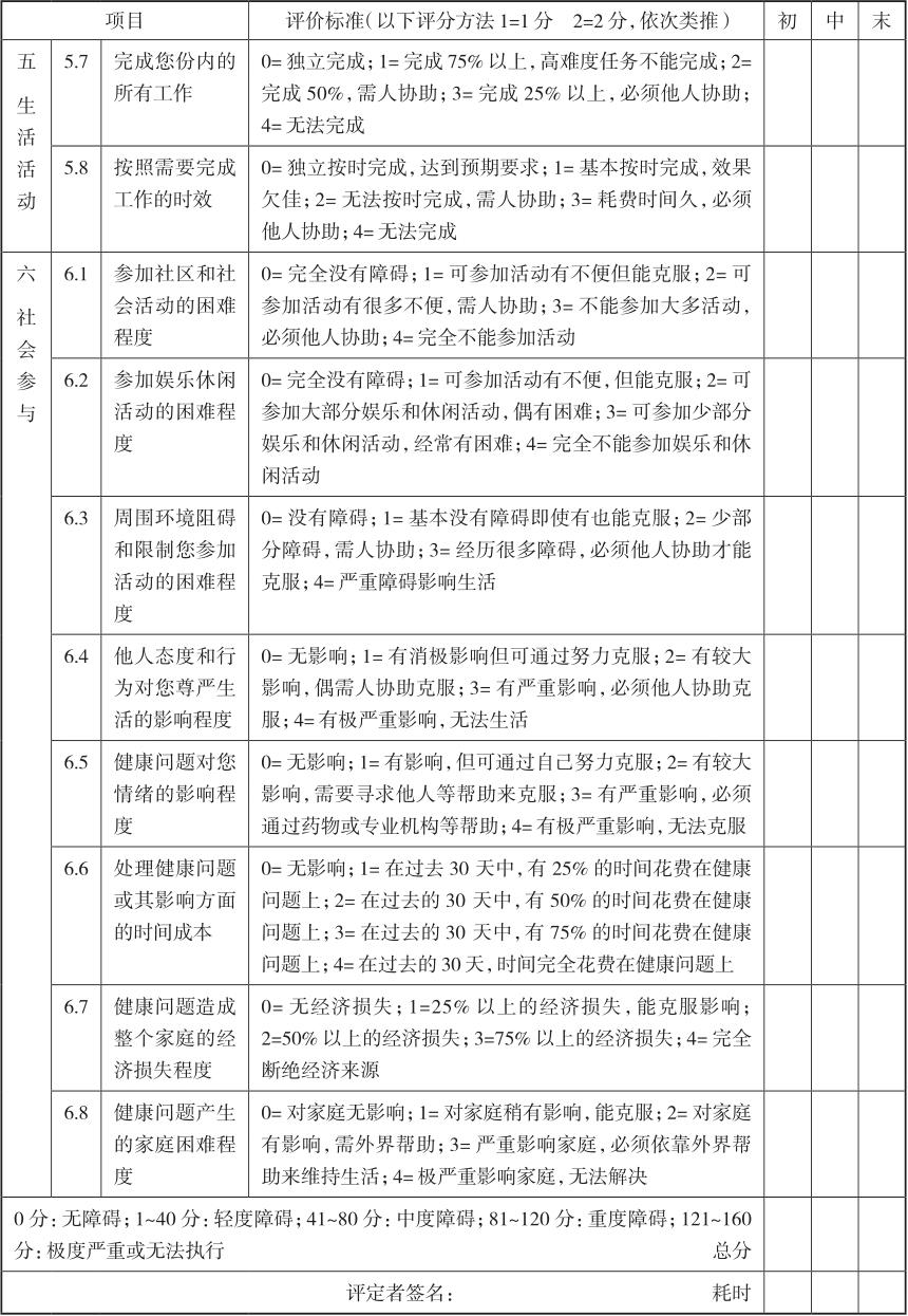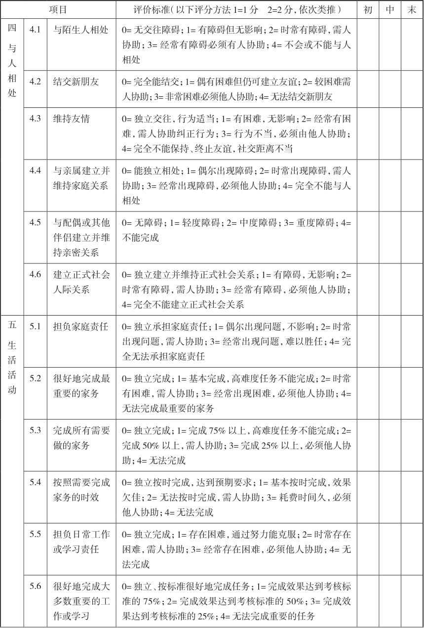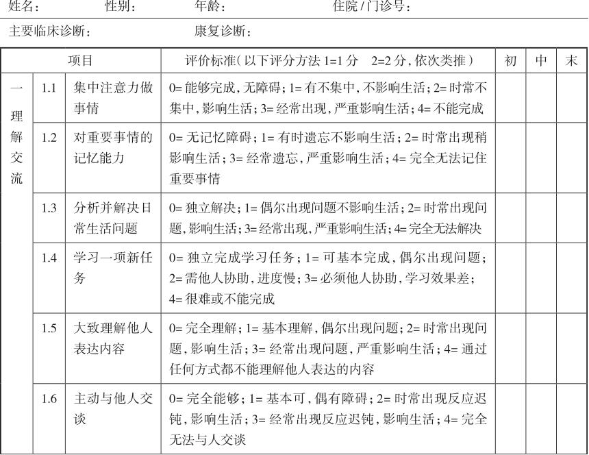 ICF活动和参与评价量表如表2-3-1所示,包括理解交流、身体活动、自我照护、与人相处、生活活动和社会参与六个领域。