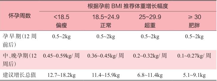 增重的情况要依据孕前的体重和身高来进行估算。对于孕前体重正常的孕妇,应根据BMI决定体重增长。单胎妊娠的孕妇,建议孕早期增重0.5~2kg,中、晚期每周增重0.36~0.45kg,整个孕期增重11.4~15.9kg最为合适,如表2-3-1。