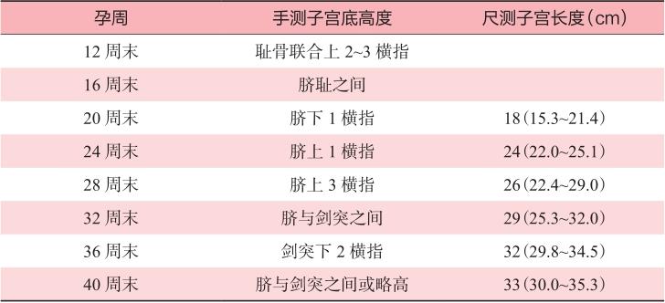表2-3-2 不同孕周的子宫底高度及子宫长度