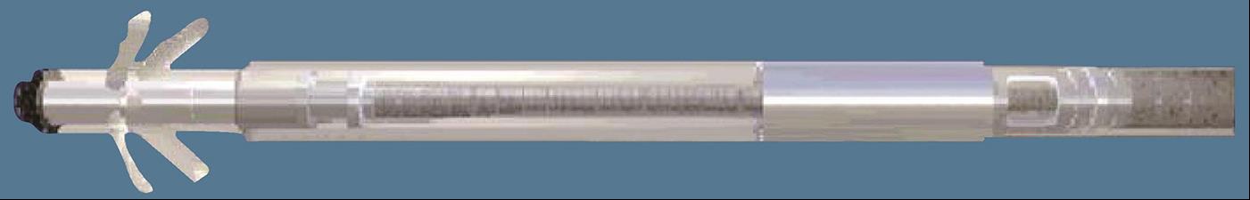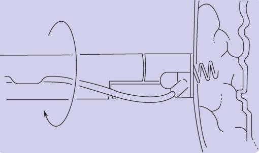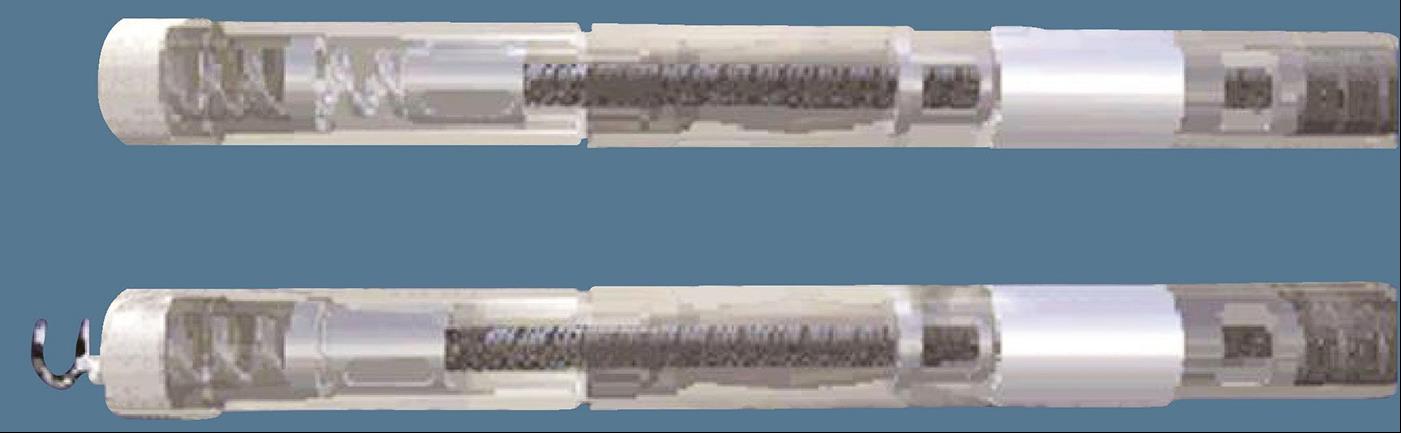 常用的主动固定导线是可伸缩的螺旋电极导线(图1-5)。经静脉植入过程中,螺旋完全缩在头端鞘内,放置到合适位置后,通过顺时针旋转导线尾端,可使头端螺旋完全伸出鞘外。可伸缩的螺旋设计是为了避免导线通过三尖瓣时,螺旋钩挂瓣叶和腱索。另一种主动固定导线是不可伸缩的螺旋导线,国内应用的有波士顿科学公司的甘露醇包裹螺旋头的螺旋导线(图1-6)和美敦力公司的3830螺旋导线(图1-7)。
