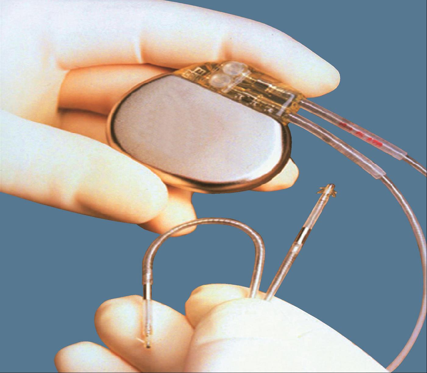 心脏起搏系统主要包括两部分:脉冲发生器和电极导线(图1-1)。脉冲发生器主要由电池和集成电路组成,能产生和输出电脉冲。起搏系统除了起搏功能外,尚具有将心脏自身心电活动回传至脉冲发生器的感知功能。电极导线是外有绝缘层包裹的导电金属线,一端连接脉冲发生器,另一端与心脏接触。它的作用是将脉冲发生器的电脉冲传到心肌,并将心脏激动的电信号回传至起搏器的感知放大器。起搏系统通过导线完成起搏和感知功能。