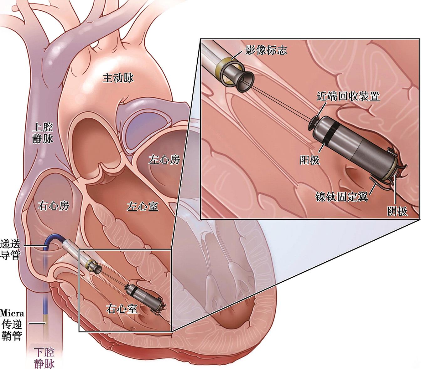 Micra经导管无导线起搏器被植入右心室心尖部,起搏器近端通过栓绳与递送系统连接,远端通过四个爪形结构固定于心肌。