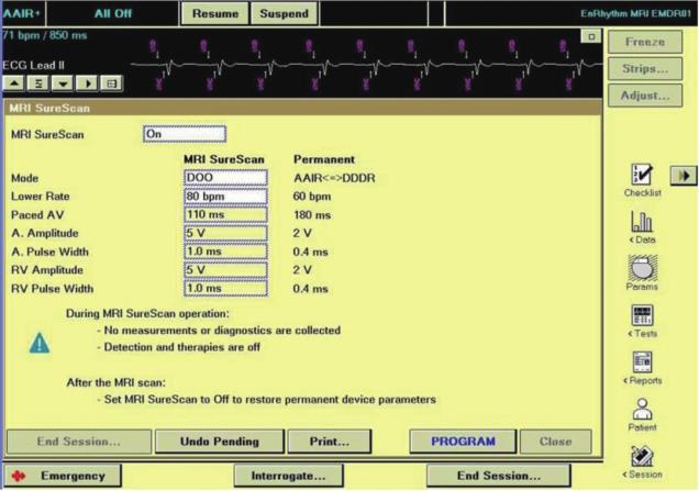 磁共振成像(MRI)检查具有无与伦比的清晰分辨软组织的能力,被认为是软组织成像的金标准,广泛应用于多种疾病的诊断。MRI检查时,会产生高强度的静磁场,低频率、低振幅的梯度磁场,以及高能量的射频磁场。这些磁场会与传统的起搏器相互作用,并将电磁能量传导至心肌,从而对患者造成不良作用,包括起搏抑制、快速起搏、电重置、脉冲发生器移位或故障以及导线发热,甚至导致心律失常发作或穿孔,并危及生命。因此,植入心脏起搏器一直以来被放射科和心内科医师认为是进行MRI检查的禁忌证。为解决起搏器患者不能接受MRI检查的难题,各家起搏器公司对传统心脏植入器械进行了改良。研制了可兼容MRI的脉冲发生器和导线。通过最小化使用铁磁材料、改进内部电流、改进簧片开关以及导线滤波等方法,以增强抗干扰能力。而且在MRI检查前需要通过程控仪一键将患者的CIED程控为MRI下工作的安全模式。MRI检查结束后,可再次通过一键程控将患者的植入器械恢复到MRI检查之前的设置(图1-11)。多项临床研究显示了MRI兼容的CIED在MRI环境下的安全性和有效性。