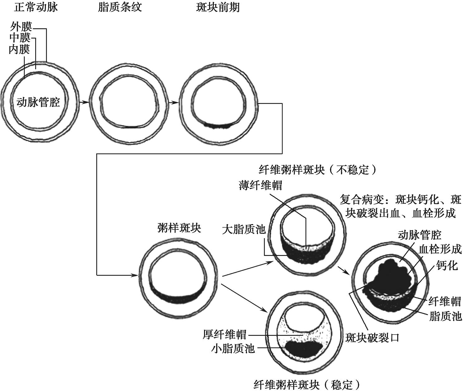 图2-6 动脉粥样硬化进展过程血管横断面结构示意
