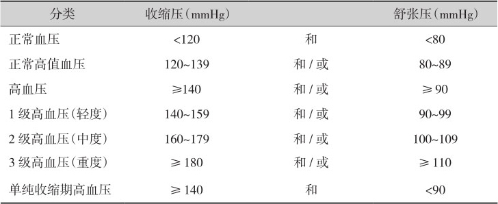 注:当收缩压和舒张压分属于不同级别时,以较高级别作为标准。以上标准适用于任何年龄的成年男性和女性。