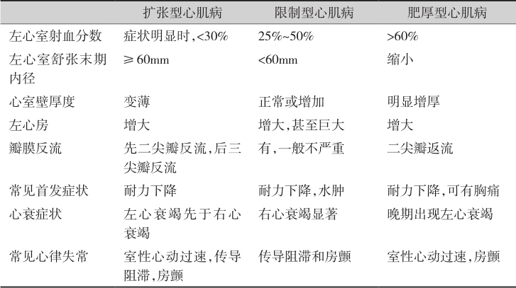 目前心肌病的分类为:①遗传性心肌病:肥厚型心肌病、右心室发育不良心肌病、左心室致密化不全、糖原贮积症、先天性传导阻滞、线粒体肌病、离子通道病(包括长QT综合征、Brugada综合征、短QT综合征、儿茶酚胺敏感室速等);②混合性心肌病:扩张型心肌病、限制型心肌病;③获得性心肌病:感染性心肌病、心动过速心肌病、心脏气球样变、围生期心肌病。3种常见心肌病的比较见表2-2。