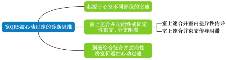 宽QRS波心动过速(wide QRS complex tachycardia,WCT)是指QRS波时限≥120ms,心率>100次/min的心动过速。宽QRS波心动过速以室性心动过速最为常见,也可见于室上性心动过速伴功能性或固定性束支、分支阻滞,以及预激性心动过速合并逆向性房室折返性心动过速。宽QRS波心动过速的诊断主要依据病史、体检及实验室检查三方面的资料,经全面分析后做出诊断,但12导联心电图仍是宽QRS波心动过速鉴别诊断的基石。