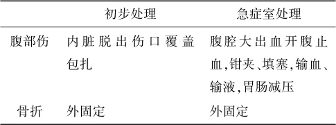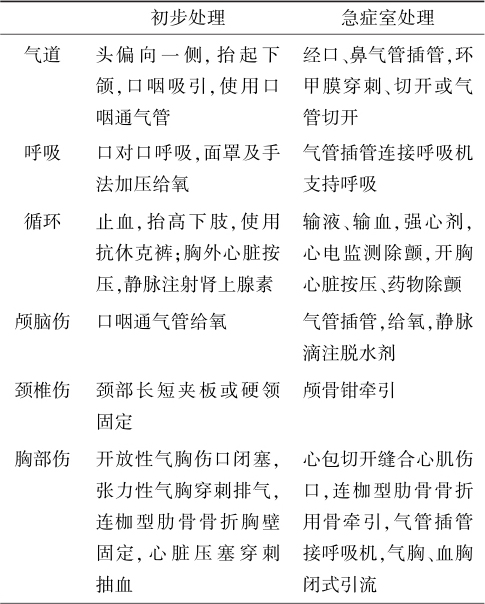 首要的是抢救生命。大批伤员时,应检伤分类。暂无生命危险者,可行系统检查,确定性治疗。有危及生命的应紧急抢救,稳定伤情,然后再行检查和处理。