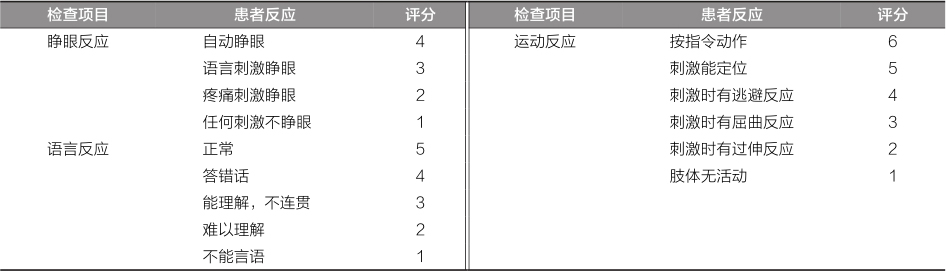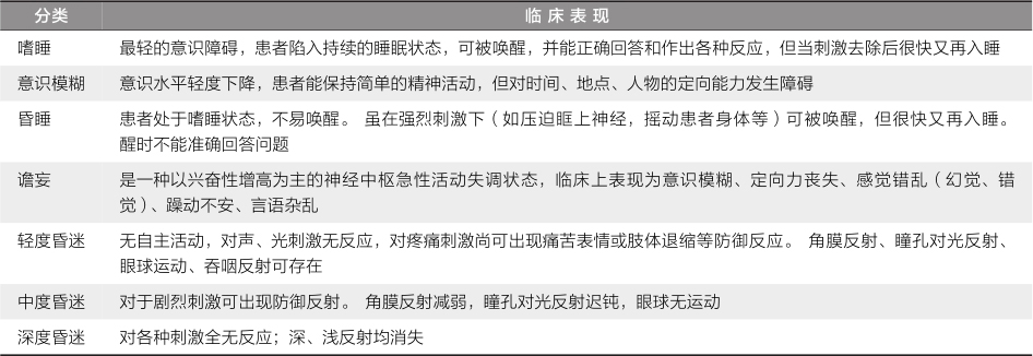 根据患者觉醒程度不同,分为嗜睡、昏睡、轻度昏迷、中度昏迷、深度昏迷,而另外两种特殊的状态为意识模糊和谵妄(表3-3)。