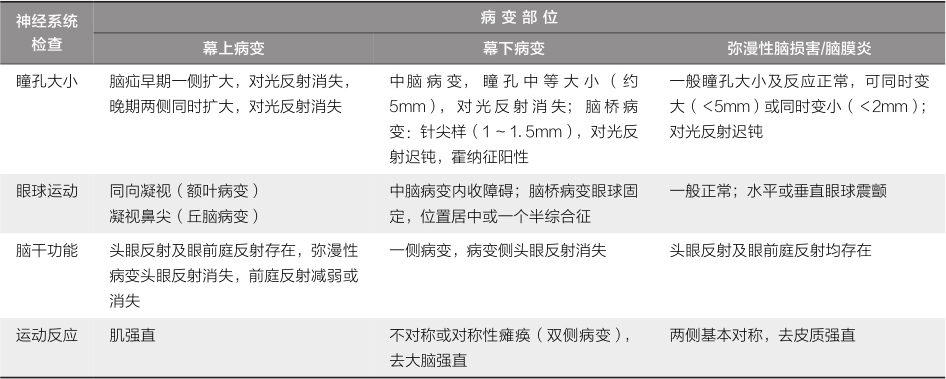 表3-5 不同病变部位对瞳孔、眼球、脑干及运动反应的影响