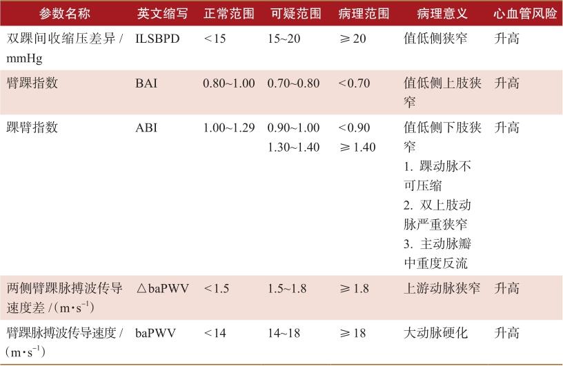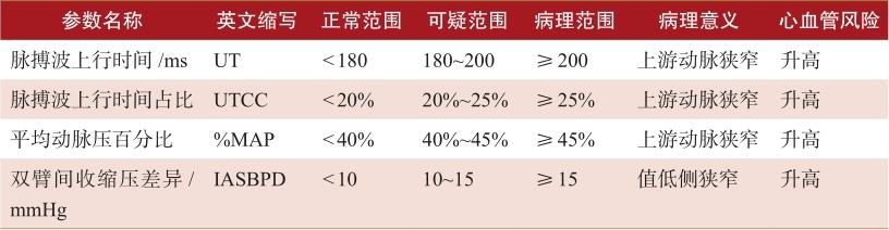 表2-1 建议的常用同步四肢血压与踝臂脉搏波传导速度参数及衍生值参考范围及临床意义